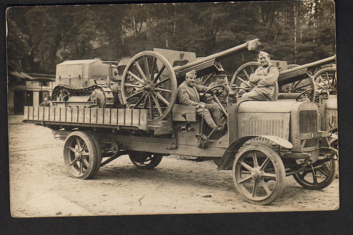 Alte Postkarte mit französischen Lastwagen und geladener Kanone und Schlepper !